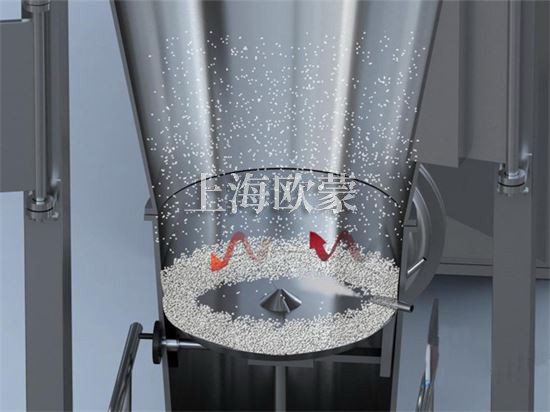 空氣經(jīng)加熱凈化后,由引風(fēng)機(jī)從下部導(dǎo)入,穿過料斗的孔網(wǎng)板。在工作室內(nèi),經(jīng)攪拌和負(fù)壓作用形成流態(tài)化,水份快速蒸發(fā)后隨著排氣帶走,物料快速干燥。