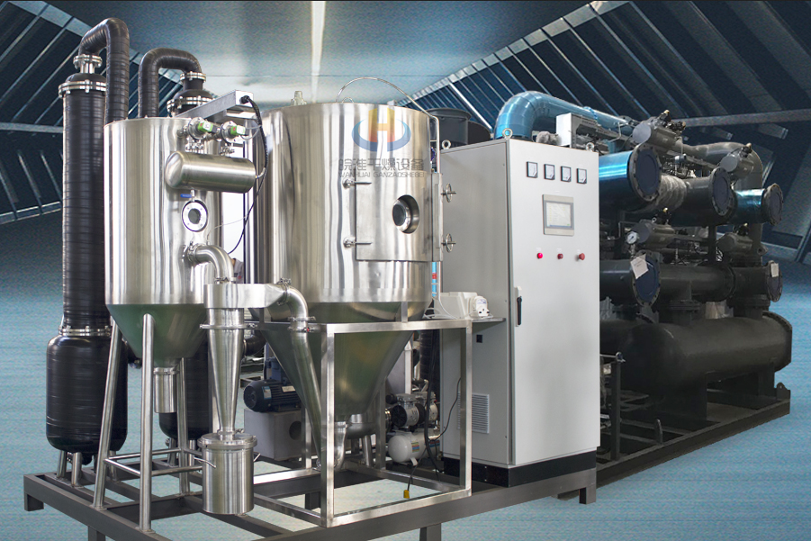 閉式循環噴霧干燥機系統由噴霧干燥機主機、帶空氣過濾器的加熱器、鼓風機、水氣分離器、大小冷卻塔、噴淋塔、排風機、一級旋風分離器、二級旋風分離器、泵、測氧儀以及管路與控制閥等組成。